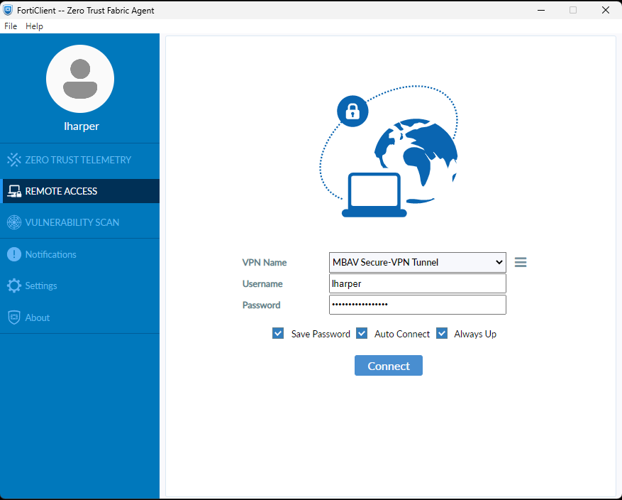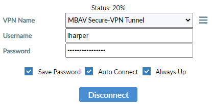 Additionally - Tick Save Password, AutoConnect, And Always Up to maintain access to the company network.